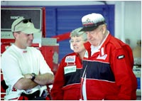 Saturday Morning No one seems to have suffered to much from the late night, but that may be the excitement and adrenaline of the day, today the race begins. Shane Donley has been out this morning testing the repaired Keiler, and he's happy. Gone are the problems that hurt them in qualifying, the car is stable and fast. A discussion with David and the crew chief results in a decision to change third gear. Changes made last night to allow the car to run faster at lower RPMs in fifth have resulted in some odd gear spacings, and a new third should cure this. The crew begins to dismantle the transmission. Despite the added work, everyone's in great spirits. The running joke in the garage is that Shane is going to be in trouble with the France family, who own Daytona and NASCAR, as well as a big stake in USRRC. Apparently, despite the fact that it was Kris who drove the car onto the well-tended, bright green grass in front of the main grandstands here at Daytona, ESPN2 reported that Shane Donley was driving the car. Everyone jokes that there would have been more than suspension troubles had they driven it onto the painted Daytona logo.